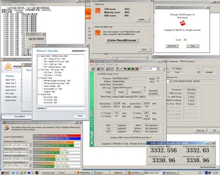 除了1.4GHz版本的Celeron4-M,2.2GHz的频率也时常能够看到。由于倍频死锁的缘故,此时只能超频至133MHz外频,不过主频也达到了2.93GHz,能够令人满意。在相同主频下,Celeron4-M 2.2GHz的超频效果或许不如低频率版本,毕竟此时前端总线只有可怜的533MHz。但是不要忘记,用户可以为此选配价格更低的845E甚至845D主板,而且内存也只需要DDR333即可。