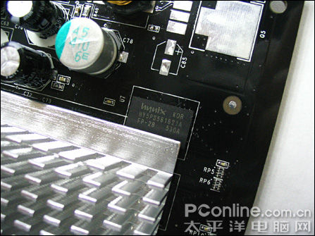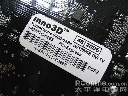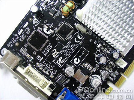 由于这款显卡搭配了FBGA封装的现代GDDR2显存的编号为:HY5PS61621A,速度为2.8ns,默认频率达到了700MHz。显存规格是128M/64bit,通过nVIDIA的TurboCache技术共享系统物理内存达到256M显存。