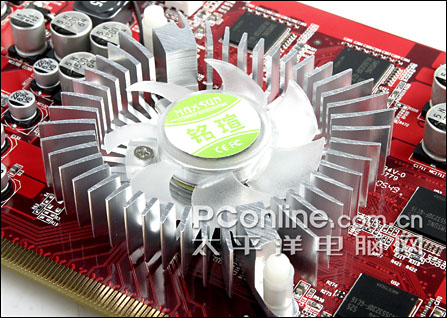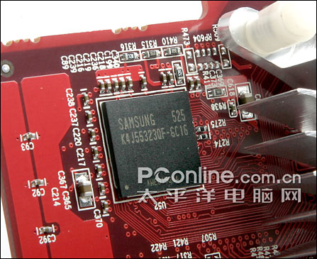 铭?狂镭X1300钻石增强版采用了三星GDDR3 1.6ns显存颗粒,正面4颗显存组成了主流的128M/128Bit的容量/位宽搭配规格,900MHz的显存默认工作频率较为保守,因为1.6ns的GDDR3显存理论工作频率可达1250MHz,对喜欢挑战超频的玩家来说无疑非常振奋。