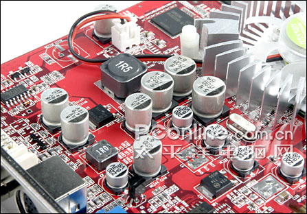 供电设计采用了显存和核心分开供电的模式,多颗大容量铝壳电容和密封电感十分醒目。