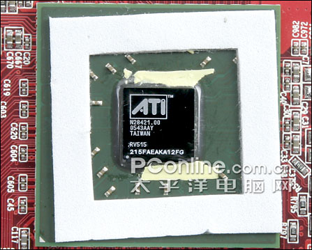 RV515图形核心,05年43周封装,基本上还使用较为柔软的垫脚,有效地保护图形核心。