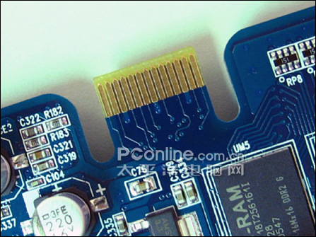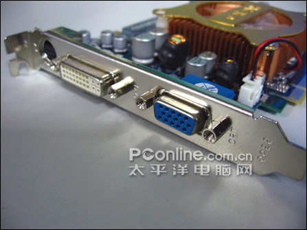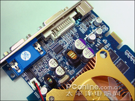 显卡背面特写,电路走线清晰,焊点饱满,整体做工还算扎实。接口方面,采用VGA+DVI+TV-Out的全接口设计,可以满足不同用户的需要。值得一提的是,它的TV-Out接口为9-pin接口,可以连接任何一台电视机,甚至是高清晰度电视HDTV,这得益于GPU内集成的可编程视频处理器(PureVideo),可硬件支持高清晰度视频解码功能。