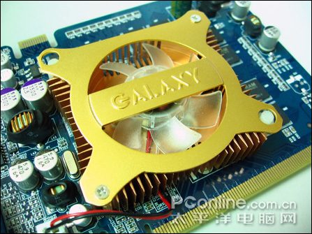显卡采用了主动散热方式,影驰非玩家版常用的四散式黄金色风冷散热器独立在电容以及8颗GDDR2显存颗粒的中间,散热风以放射状对周围进行强冷散热。