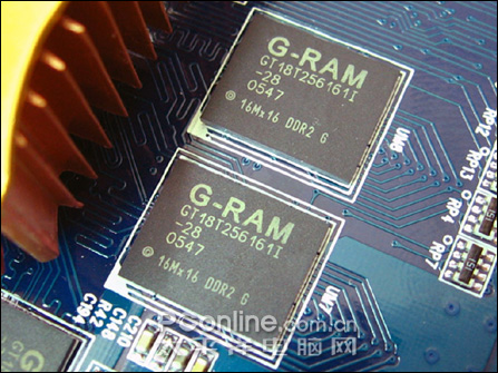 显存采用的是G-RAM 2.8ns GDDR2显存颗粒,显存规格为256M/128bit,默认显存频率为700MHz。