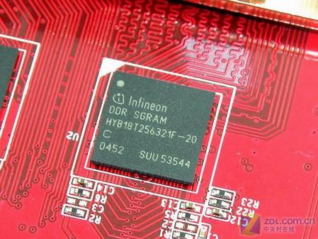 显存为英飞凌原厂GDDR3 2.0ns,4颗8bit×32M存储颗粒组成了128bit 128M的双128结构,900MHz的显存频率设置对于英飞凌2.0ns GDDR3显存颗粒来说比较保守,实际能稳上1000MHz的显存频率没任何问题,极限频率更是达到了1.1GHz以上,超频能力还是相当强劲。