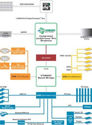 K8M800是K8T800系列中的一款,集成了UniChrome Pro图形核心,带有128位2D/3D引擎,2个扫描管200MHz速度,以及硬件MPEG-2加速。在这款新品上VIA还提供了800MHz的HT总线,V-Link连接到VT8237 I/O hub 提供PCI、USB、Parallel ATA、Serial ATA-150控制器。此外,基于K8M800的主板还将具备VIA的5.1或7.1声道声卡以及Giga网卡。