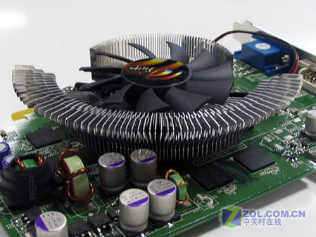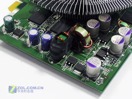 翔升6600GT超值版采用绿色的PCB版,显卡严格遵循nVIDIA公版设计。用料做工方面符合公版标准,没有缩水痕迹,供电电路中采用了大量高档的三洋固体聚合物导体电容,为显卡的稳定工作奠定了基础。