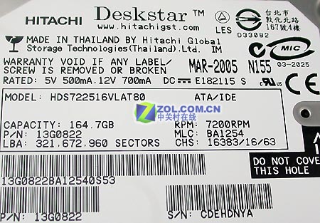 该款产品属于日立7K250系列,最大设计容量为250G,单碟容量80G,转速7200转/分,平均寻道时间8.8ms。产品规格号为HDS722516VLAT80,其中“HDS”为日立硬盘产品前辍,72代表代表转速为7200RPM,25表示属于7K250系列,16代表容量为160G,VLAT表示采用U-ATA100接口,80表示产品二级缓存为8MB。序列号为13G0822,生产编号为BA1254。该硬盘的工作电压为5V/12V(500mA/700mA),整块硬盘产地为泰国,生产日期为2005年3月。