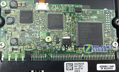 PCB正面使用常规的制造技术,所有上面的主轴控制芯片、缓存芯片和其它的元件均分布在PCB的正面。PCB走线清晰,用料充足,整个PCB产自马来西亚。