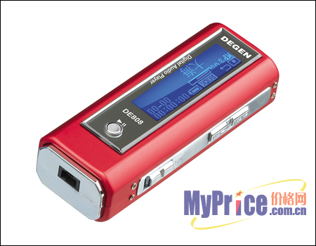 德劲 DE808是一款专门为情侣们设计的MP3,它设计有双耳机插孔,可以同时接入两个耳机欣赏音乐。整体为矩形,体积为73×26×18mm,采用了纯金属亚光铝合金面板的外壳,经过特殊处理的材料在抗划痕性能上较为出色。机身由紫红色(宝蓝色/银白色)和亮银色的色泽搭配,小巧可爱,重量不足40克。