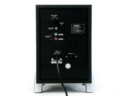 其4个支脚上都附带有胶皮垫,能很好的与光滑桌面接触,抑制谐振。其背面只有一个低音调节,这是因为主音量调节被设计到线控器上,背面省略掉了。