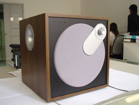 音箱的前面板是黑色与白色的经典组合,在黑色的面板中间嵌入圆形的灰白网罩,让人不禁联想起老式的收音机,给人一种怀旧的感觉。而且,前面板设计的简洁流畅、层次分明,在充满复古气息的同时还流露出一种时尚的味道。