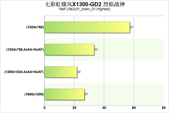 而在《半条命2》中,由于《半条命2》对于显卡核心的要求很高,基于RV515核心的X1300取得不少优势,X1300基本能流畅的通过1024的分辨率测试。