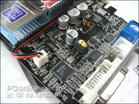 显卡供电部分以及低通部分特写,用料充足。Silicon Image的164CT64芯片为显卡提供DVI的输出,不过 S18内核不集成数字信号输出的做法,显然会增加显卡的整体成本。