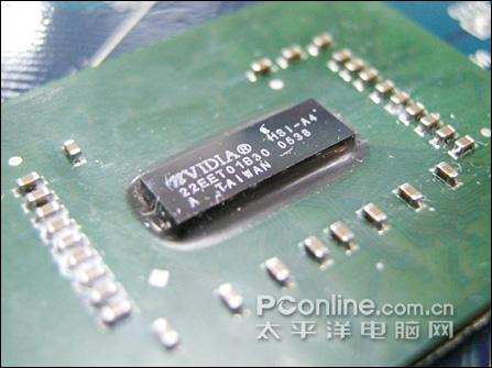核心特写,影驰6600GE AGP版使用Geforce6600核心,特效支持方面同PCIE版一样,具备3条顶点处理管线和8条像素处理管线,支持CineFX3.0引擎、Intellisample 3.0、UltraShadow II阴影计算技术。