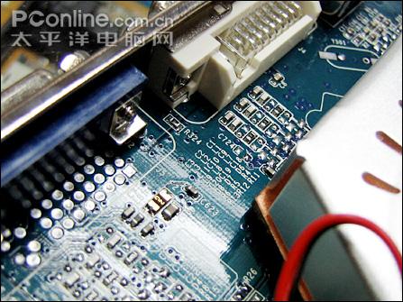 影驰6600GE AGP的供电部分采用了SANYO OSCON系列固体聚合电容,并且提供了4针辅助供电接口。