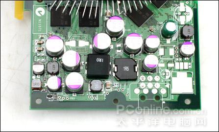 显卡做工方面较为扎实,采用了紫色三洋 OSCON铝壳固态电容组成显卡供电电路,为显卡的稳定工作和一定的超频操作提供基本的电气需求。