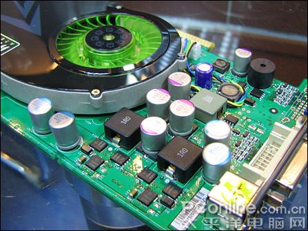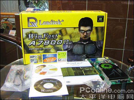 丽台A7800GS TDH在镁光灯下流光溢彩。由于AGP供电能力有限,该显卡还需外接4pin电源。