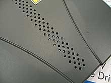 惠普DVD740E主要的数据传输方式,还是通过USB2.0进行,这里仅提供了唯一的端口,省略了先前IEEE1394规格数据连接的配置。电源需求上,仍就是开关式电源设计,通过变压器调节后即可让光驱运行。新款的惠普DVD740E,硬盘盒增加了通风口,主要位于光驱底部,通过机体内风扇,然后利用通风口、卧式摆放的支架高度,形成风流将热量排除体外。由先前的水平散热,变成垂直散热。这样的设计,在以往设备上是比较很少见的。此外,附件还配送了立式摆放的支架,光驱自身可立、卧摆放。