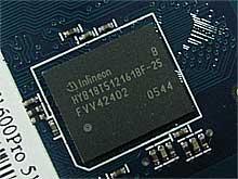 该卡显存容量达到512MB的极限,颗粒选择德国英飞凌2.5ns,正反合计8枚,结构512MB 128bit,默认工作频率800MHz,超频空间有限,对于选购的用户,恐怕更多是看重大容显存的利用价值,而并非频率上的冲刺。