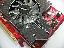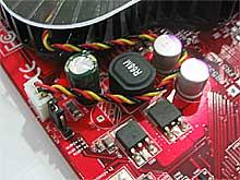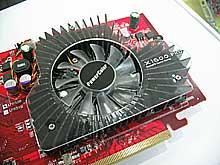 供电模块中,基本以帖片电容为主,直立的电容颗粒是一色的三洋品牌,电源稳定性上不容忽视,为核心超频提供了硬件的基础。散热器再次延续了X800GTO3的经典造型,透明的塑胶片,给出很时尚的视觉感观,并对鳍片灰尘问题,也可以进行监控。散热片体积较大,添置在散热片的中心部分,这点和蓝宝的顶端设计有些不同。从效果上来说,对核心的散热支持,这样设计会更好一些。