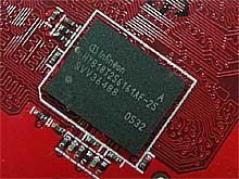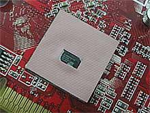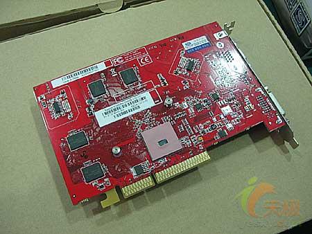 PCB基板背部,我们再次见到了Rialto桥接芯片,ATi原厂芯片,工艺成熟,无需加载散热器材即可工作。先前在AGP版的RV430、RV410核心的“X”系列产品中,拥有成熟稳健的表现。这里也是为了防止运输和使用过程的磨损,芯片表面覆盖了胶质帖片,加以保护。显存单元配备了韩国英飞凌2.5ns颗粒,双面镶嵌了8枚芯片,构成256MB 128位空间,默认核心/显存频率达到500MHz/800MHz。