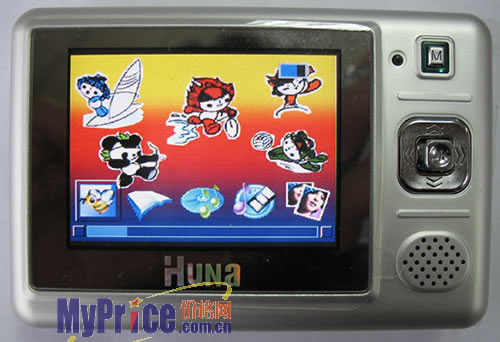 2.5英寸的TFT屏幕占据了正面机身的3/4,给人的视觉效果相当不错,其余1/4处安放了MENU按键、五维导航键和外置喇叭。而在背面则注明了各个接口的名称,用的都是立体金属字。