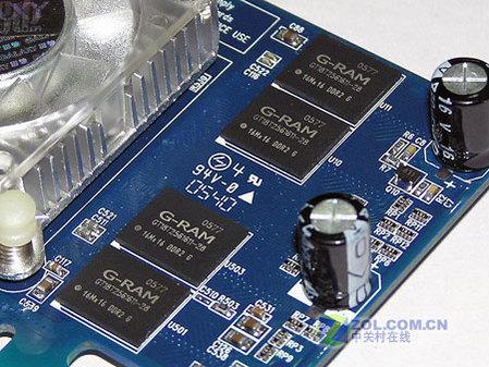 显存方面,影驰6500显卡采用了2.8NS GDDR2显存颗粒,正面4颗,组成128MB、64BIT显存规格。尽管只有64bit的显存位宽,但是这款影驰6200A标准版的游戏实用性还是相当不错的,3D游戏性能足够应付当今的主流网络游戏。