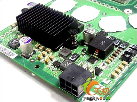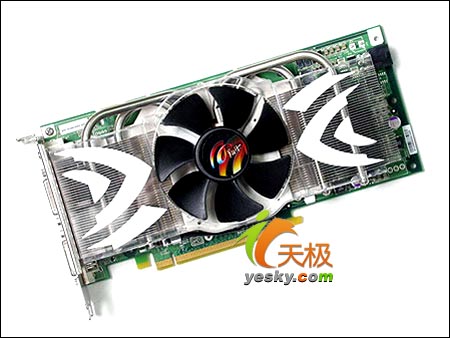 翔升权杖7800GTX 512M采用的是编号为P348的完全公版设计。散热采用的是Single Slot散热器。使用了8厘米的散热风扇,所以可以在较低转速的情况下保持足够的出风量,高密度的金属散热片可以最大限度的保证显卡的散热效果。同时为了及时帮助图形核心散热,翔升权杖7800GTX 512M还使用了4根热管连接与显示核心接触的铜金属。低转速大直径风扇+高密度金属鳍片+4根热管为翔升权杖7800GTX 512M安静的工作奠定了基础。