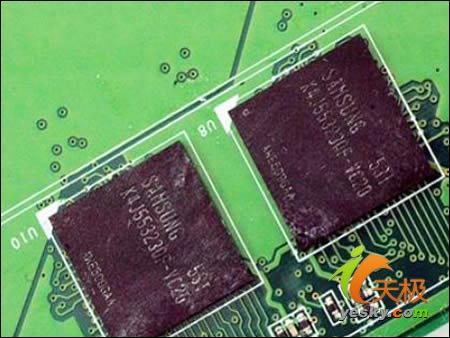 显卡供电部分采用了大量小贴片电容、三洋固体电容,为显卡的稳定工作提供了保障。显存方面,XFX讯景6800GS使用了8颗三星出品的2.0ns GDDR3显存颗粒,运行频率1GHz,单颗规格为8M×32bit,8颗加起来的总容量/位宽就是256MB/256bit,完全能够满足当前3D应用的需求。