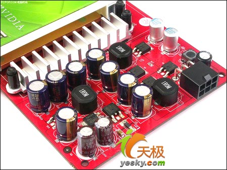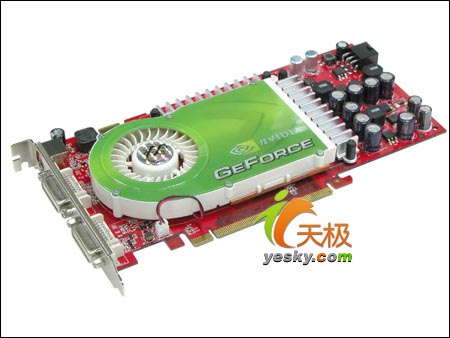 供电部分集中在显卡右端,这样对显示输出的干扰也大大减少。版面配备了大量的高品质电解电容和屏蔽式高品质电感,保证了优质的供电效果。另外,大面积的散热片加上主流散热的大风扇,使其散热效果非常出众,即使在超频状态下,也可以保证显卡的稳定运行。显存方面,其搭配的是512MB -1.2ns 136pin高速GDDR3显存,组成256bit/512MB的强劲规格,运行频率高达450/1200MHz。