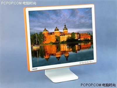 阳光1800搭配了目前主流的17英寸LCD,白色和橙色的搭配看上去非常时尚,有些苹果味道的底座既稳固又可以减小桌面占用面积,特别是对于桌面环境较小的用户来说,非常适用。