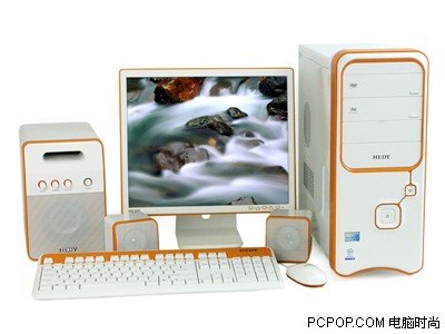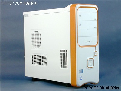 同样是白色和橙色搭配的主机看上去和LCD一样落落大方,前面伴的几个简单的点缀给一种较多地遐想空间。从外观上我们可以看到,主机在散热上采用的目前主流的38度散热结构,我们在实际的使用过程中,也确实发现它的噪音特别小。
