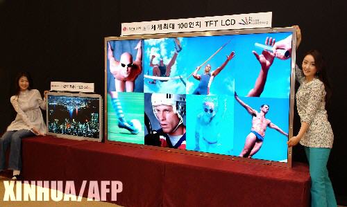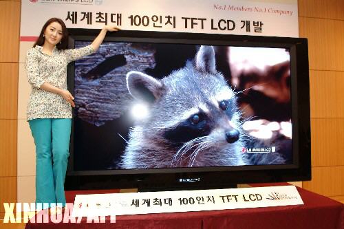 3月8日,在韩国坡州,工作人员在展示LG-飞利浦公司开发的100英寸TFT液晶电视面板。