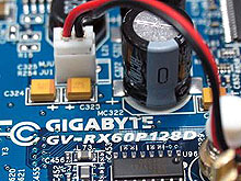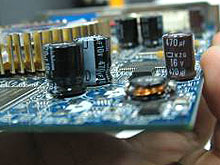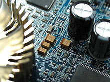 技嘉X600PRO采用了惯用的蓝色PCB板,因为只采用了风扇作为散热设备,减轻显卡重量的同时提高了散热效率。这款产品还有一个非常明显的特点,采用了大量的钽电容来取代我们常在显卡上能看到的电解电容,这样一来自然可以使显卡稳定工作在更高频率下,当然也更有利于超频。而这种设计完全符合ATI RX600PRO标准,并且市面上很少能看到这样的优质显卡。