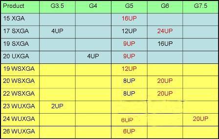 遵循这个道理,如何充分利用一张液晶,使其切割出最多的屏幕,也就直接关系到面板厂商的获利情况。目前,台系面板厂商以5代线为主力生产线。从下表中可以看到一张液晶,能够切割出12片 17寸SXGA或9片 19寸SXGA屏幕。同样用来切割宽屏,能够获得12片 19寸WXGA或8片 20寸WSXGA宽屏幕液晶。同样一张液晶,即可以切割12片 17寸SXGA屏幕,也可以切割12片 19寸WXGA宽屏幕。也就是说,一般宽屏幕的液晶显示器面板在面板厂产线的切割上,19寸宽屏幕面板略等于17寸面板。很显然,在5代线19寸宽屏具有绝对的优势。