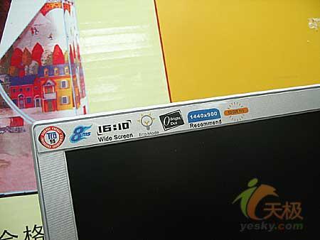 液晶193FW的看点,在边框上的LOGO都有提示,其中,16:10的分辨率比率,0亮点保证标签、50000小时寿命、3段高亮模式,都予以了标注。