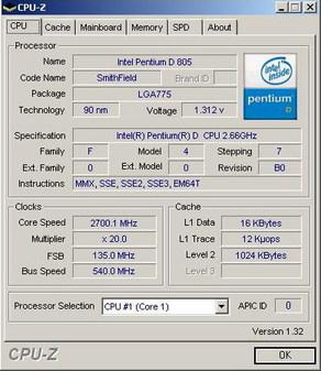Pentium D 805采用90nm制程Smithfield核心,内建1MB x 2 L2 Cache。主频为2.66GHz,前端总线由原来的800MHz FSB降至533MHz FSB,倍频为20x,电压采用1.25v至1.4v的Multiple VID,最高功耗95W。