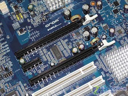 主板的另一个特色就是提供了2根PCI Express X16插槽,并且可支持交叉火力和SLI这两种时下主流的双显卡技术。当用户组建SLI时,两根插槽分别运行于PCI Express X16以及PCI Express X4模式;当用户组建交叉火力时,则运行在双PCI Express X8模式下。
