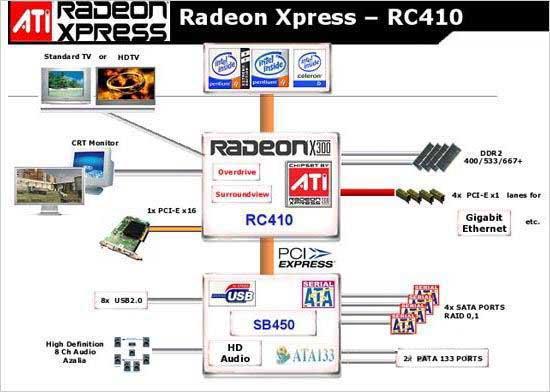 ATi的RC410可以搭配SB400、SB450或者ULi M1573南桥芯片,以便照顾到各种不同用户的需要。SB400南桥芯片在的诸多问题和缺陷已经不是ATi应该回避的问题了,ATi也明白这一点,所以很快推出了经过改良的SB450,并加入了SB400所不支持的Azalia,而原来的SB400南桥芯片以及后来的SB450,在ATi不懈的驱动补偿下,也终于有了稳定的表现。