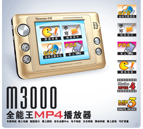 相比纽曼M2000而言,其更高端的M3000就更加适合配备在您的车上了,因为这款产品除了M2000的视频播放和智能扩展功能外,还具有GPS全球定位系统。机器内部可以安装全国各地区的地图,您开车出去不仅可以随时获得快乐的视听体验,更是可以让这款M3000型MP4作为您前进的指南针。