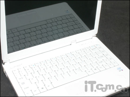 左侧接口比较简洁,估计是要给DVD光驱位置让路吧,图中最左边两个接口依次是电话、USB接口,最右边同样有一个USB接口,USB接口的下面有一个4合1读卡器 (MS、MS Pro、SD、 MMC),可以方便的插入SD卡、MMC卡等产品。右侧位置比较丰富,图中的最左边是一个PCMCIA插槽,再右边有4个接口,依次是,USB、1394、S端子、网线接口。纯白色的键盘也非常好看。键盘整体与机身贴合得非常好,每个按键的弹性和阻尼感较好,才用全尺寸的键盘设计,但是没有拥挤的感觉,这就是宽屏的好处。