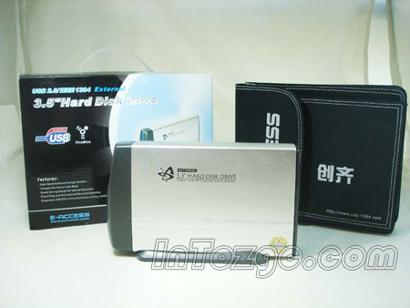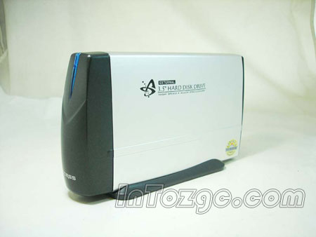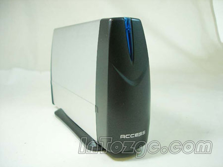 创齐3.5寸硬盘外置盒外型非常像一款小型机箱,在靠上的位置上有一个电源指示灯,当外置盒接通电源后会发出蓝色的光芒,在外置盒的下面还有一个底座。