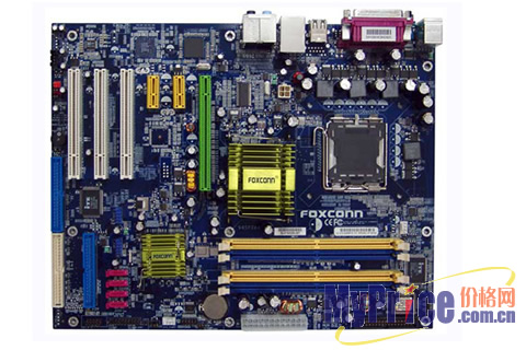 这款主板沿用了富士康865/875系列的深蓝色主板,主板采用了标准的ATX大板设计。而插件的颜色也是丰富多彩,用不同的颜色加以区分。由于主板上的插件十分丰富,因此显得十分饱满,拿在手上也有一定份量。而北桥和南桥都采用了被动式的散热方案,北桥的散热面积十分大,有利于发热量较大的北桥散热,保障了系统的稳定性。
