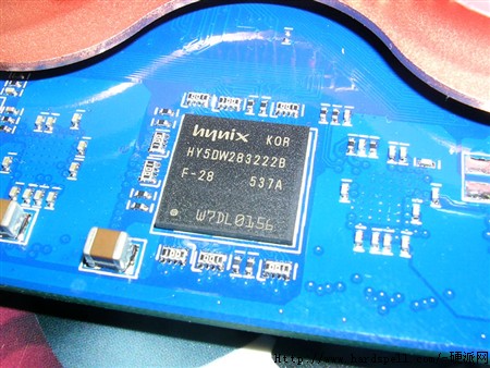 显存方面,显存容量稍觉遗憾,只是128m的规格,但是256bit的显存带宽却是千元附近上颇受欢迎的卖点。显卡采用来自HY的DDR MBGA封装显存颗粒,编号为HY5DW283222B F-28,-2.8ns的显存颗粒理论默认频率为700MHz,而显卡的显存频率也是正正运行在这个频率上。