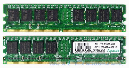 老牌模组厂商宇瞻(Apacer)它们是non-ECC unbuffered 240pin 1024MB DDR2 SDRAM内存模组,双Rank规格,PCB中央预留有配置ECC模组时的额外8bit内存芯片位置。Apacer这款内存的SPD芯片安装位置较为特别,它位于PCB正面右下角贴近金手指处,和其他DDR2模组安装SPD芯片在PCB中央的习惯有所不同。