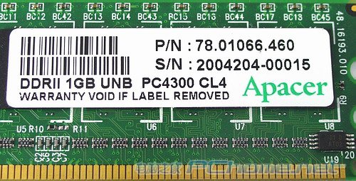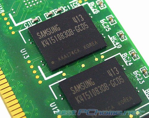 Apacer DDR2-533 1024MB DDR2 SDRAM模组搭载了来自Samsung的内存芯片,芯片编号为K4T51083QB-GCD5,512Mbit规格,64Mx8组织方式,整个模组的位宽是64bit。