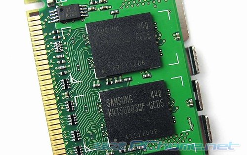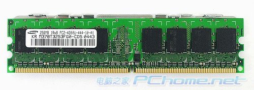 内存芯片编号为K4T56083QF-GCD5,256Mbit规格,32Mx8组织方式,整个模组的位宽是64bit。K4T56083QF-GCD5使用60-pin FBGA封装,标称速度3.8纳秒,可以在DDR2-533@CL4上运行,I/O和VDD工作电压均为1.8V±0.1V。
