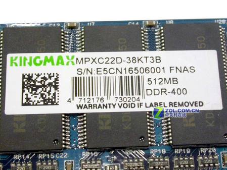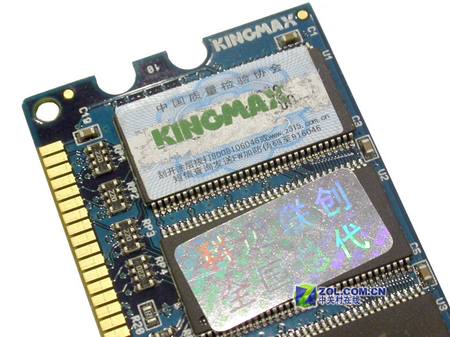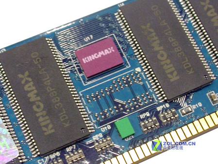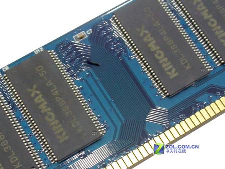 产品采用标有“KINGMAX”字样的内存颗粒,编号为KDL388P4LA-50,颗粒工作响应时间为5NS,规格为32MBx8bit。