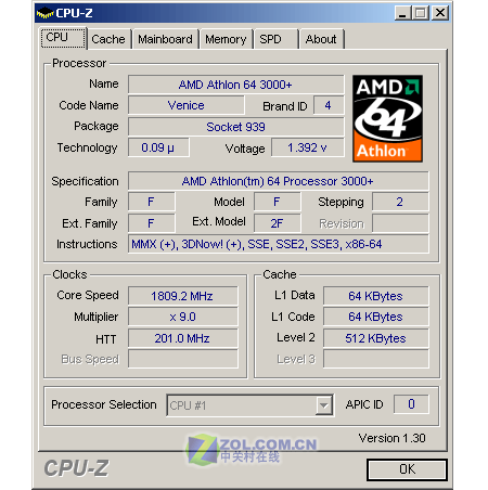 从CPU-Z当中可以看出E6核心939针Athlon 64 3000+基本参数为:Venice核心,采用mPGA封装,使用90nm SOI工艺生产;主频是1800MHZ,128K的L1级缓存,512k的L2级缓存,外频为200MHZ,倍频为9x,接口类型为SOCKET 939;CPU核心电压1.4V,功耗为65W;支持MMX(+)、3DNow、3DNow!(+)、SSE、SSE2、SSE3和X86-64指令集,并内存双通道内存控制器,Stepping(步进值)为2。